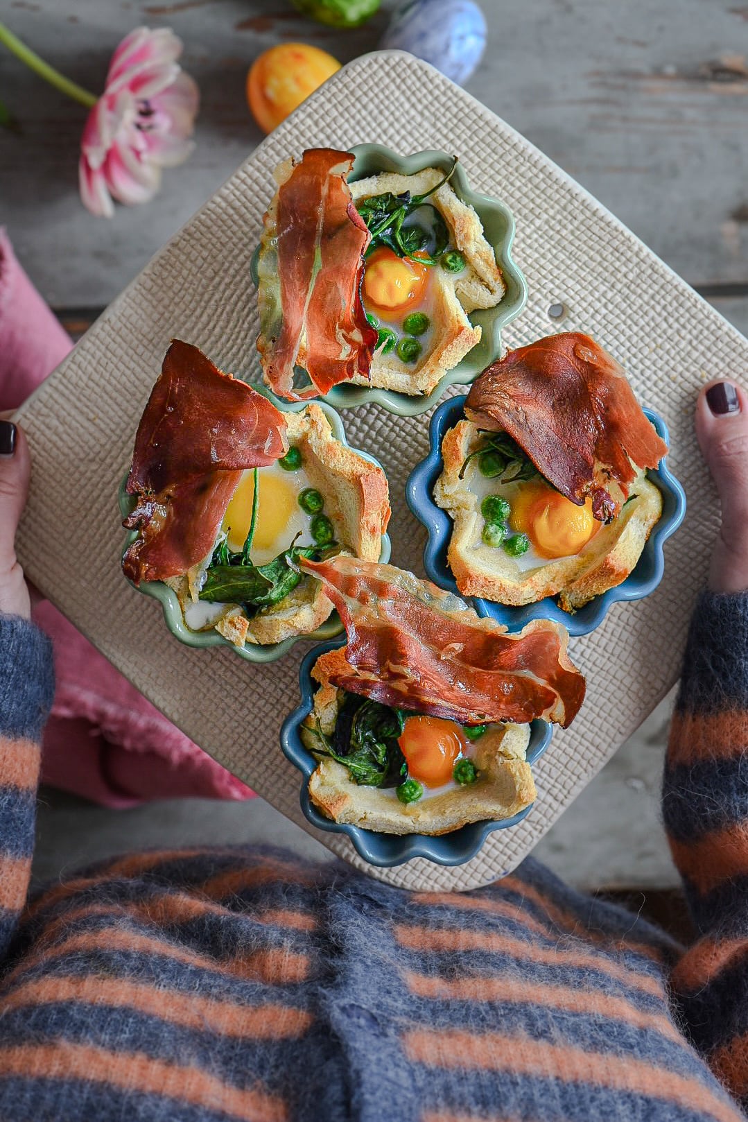 Sforneremo i toast muffin con uova e bacon croccante ; prepareremo una terrina di verdure e una tortilla di patate con verdure primaverile e uova di quaglia pink; sforneremo la torta pasquale al riso e ci sarà un cocktail di accompagnamento.