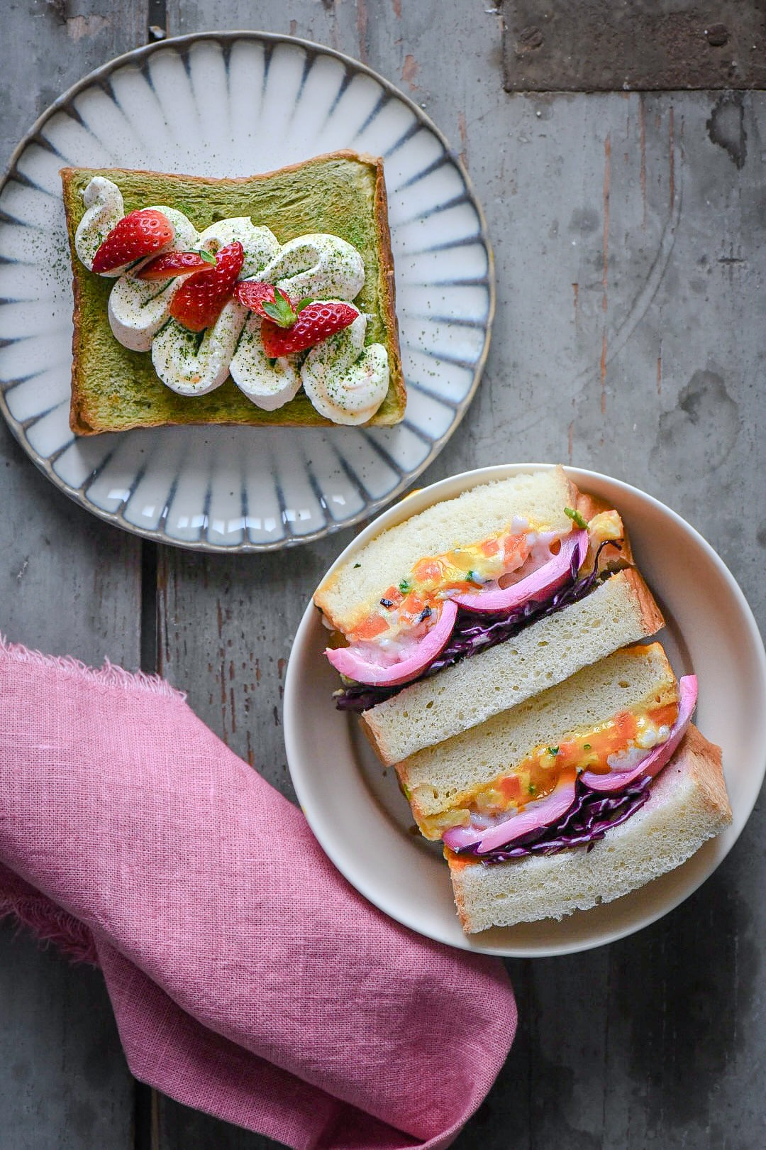 Impasteremo lo Shokupan classico e uno al matcha. Quello classico verrà farcito uova marinate, insalata di patate giapponese, cavolo fermentato. Quello al matcha verrà servito con una panna al caramello e fragole.